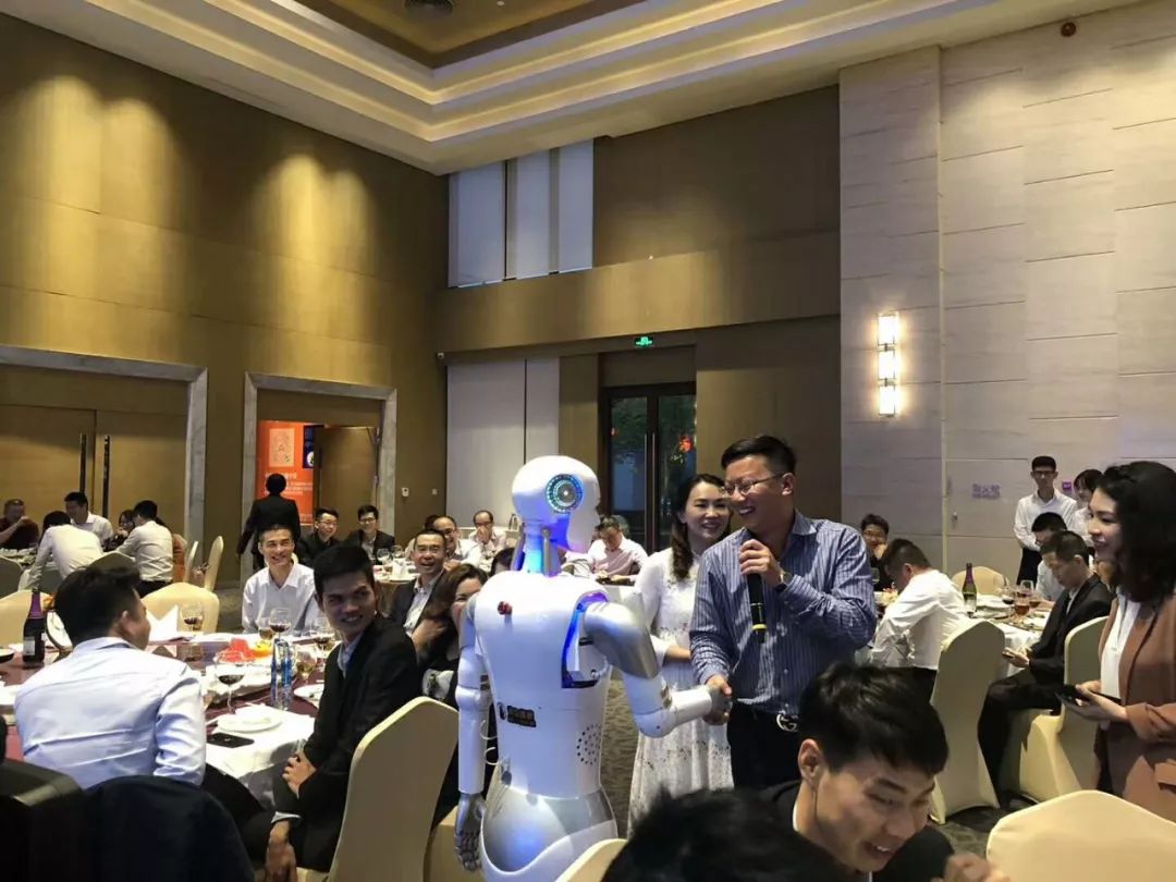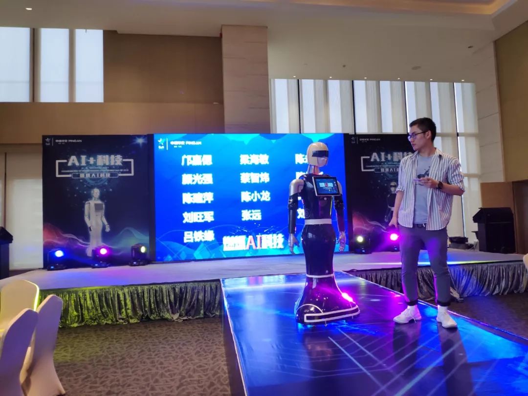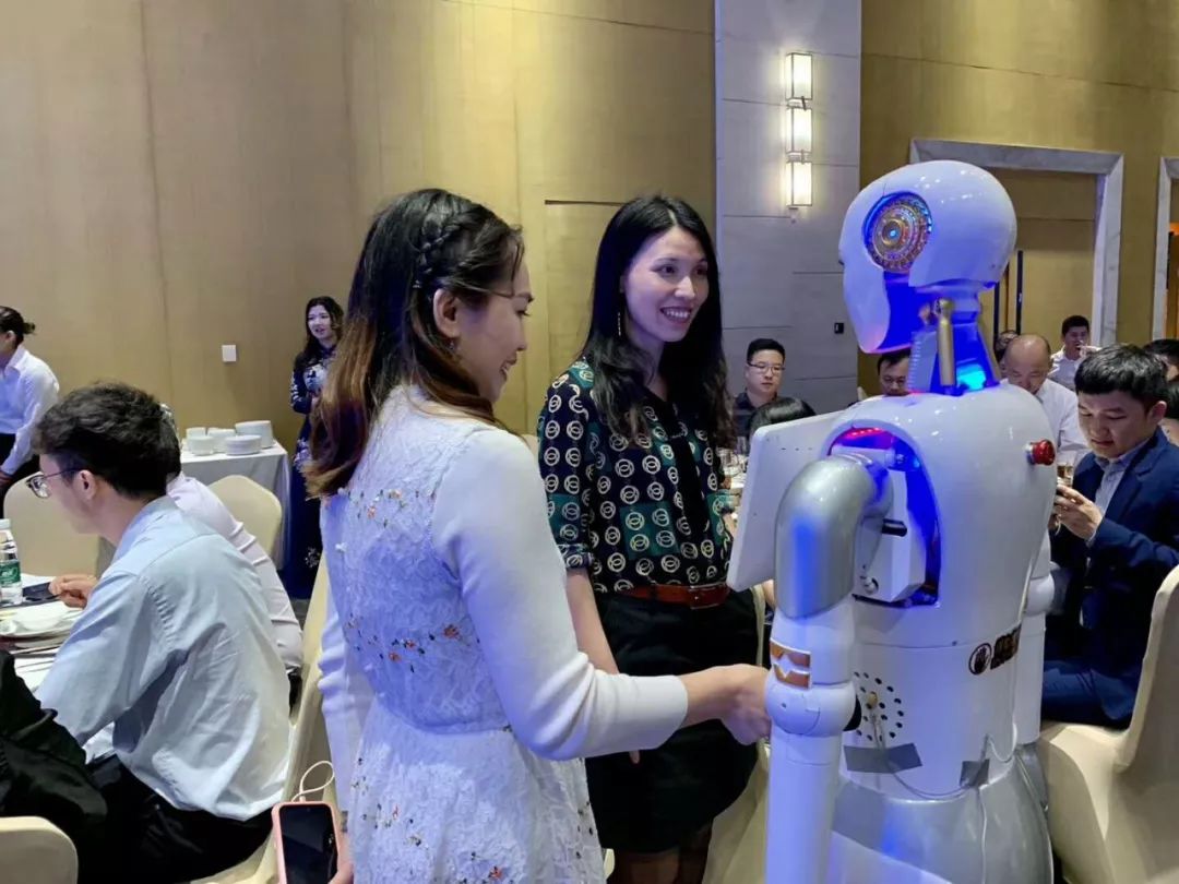 圖為澳博服務(wù)機(jī)器人藍(lán)豆在臺上頒獎