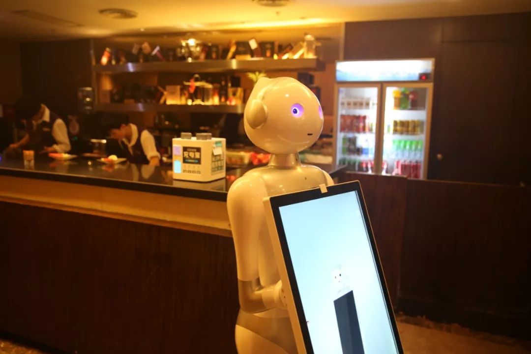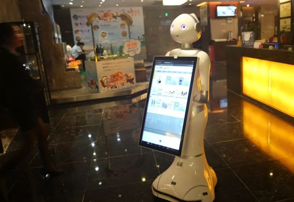 圖為澳博服務(wù)機(jī)器人蒜頭在前臺(tái)接待客戶
