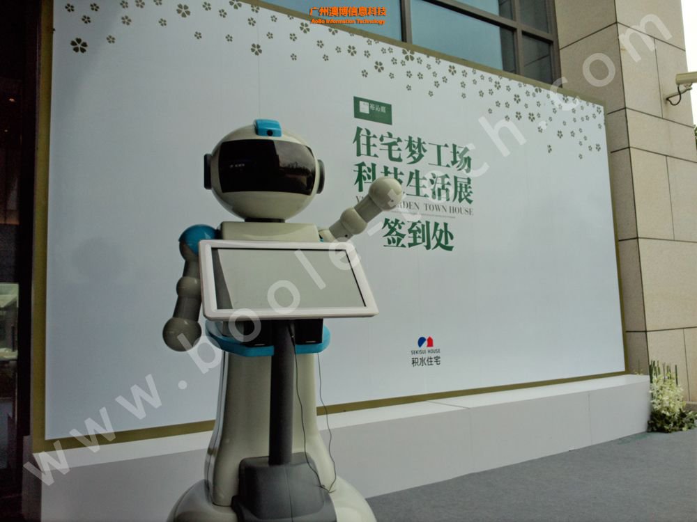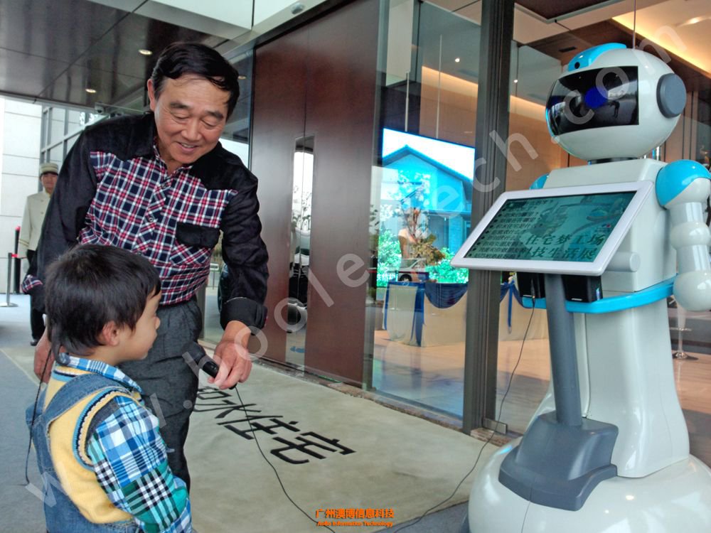 隨著游客們到來,迎賓機(jī)器人就會(huì)主動(dòng)上前打招呼,問候大家。它的胸前有一塊觸摸屏,游客們可以通過屏幕與機(jī)器人互動(dòng),瀏覽房地產(chǎn)的相關(guān)介紹資料。
